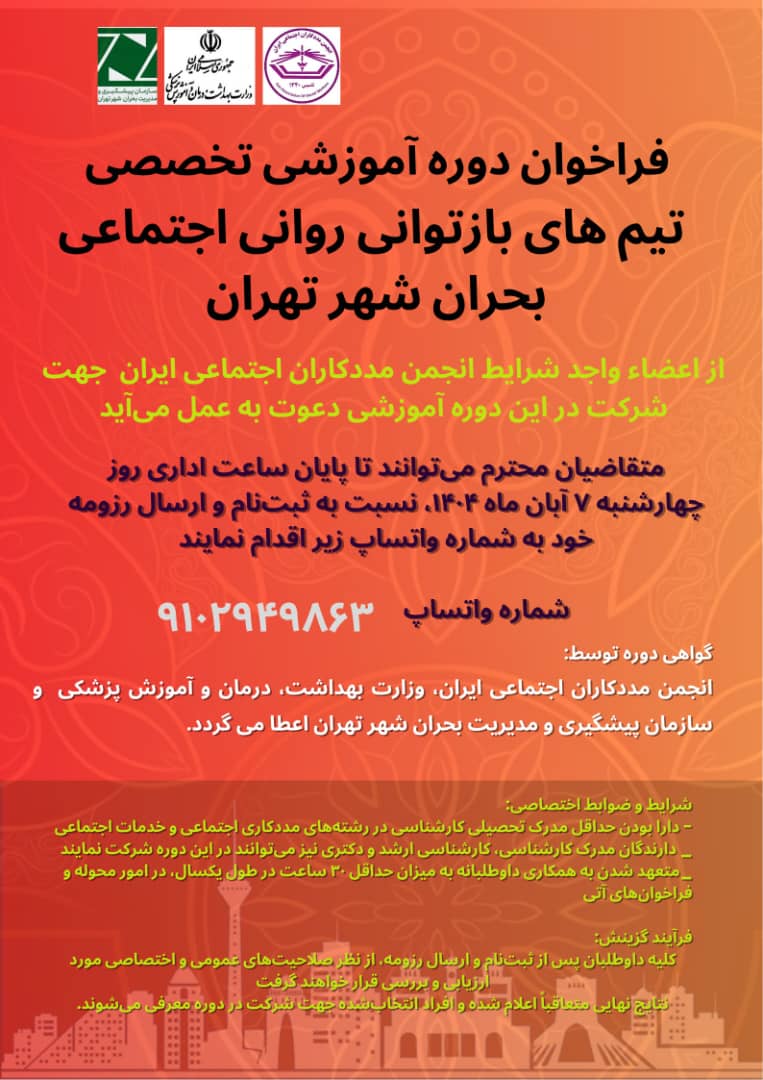 سازمان پیشگیری و مدیریت بحران شهر تهران با همکاری انجمن مددکاران اجتماعی و وزارت بهداشت، درمان و آموزش پزشکی در نظر دارد دوره تربیت تخصصی مددکاران اجتماعی در بحرانها (دوره همسان سازی آموزش کارشناسان داوطلب تیمهای بازتوانی روانی اجتماعی بحران شهر تهران) را برگزار نماید.