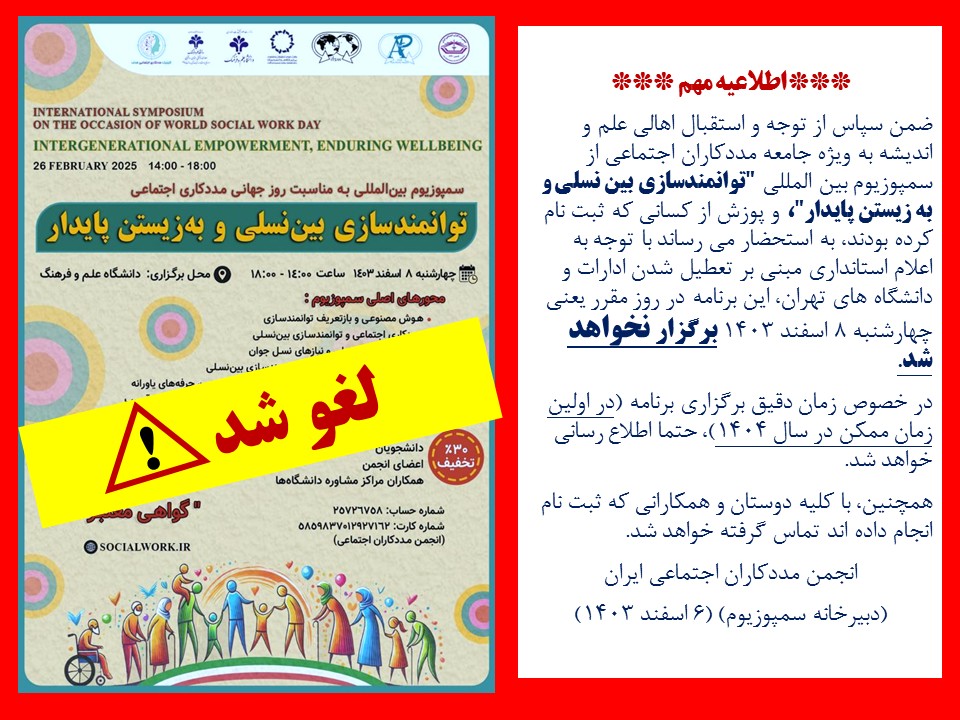 ضمن سپاس از توجه و استقبال اهالی علم و اندیشه به ویژه جامعه مددکاران اجتماعی از سمپوزیوم بین المللی “توانمندسازی بین نسلی و به زیستن پایدار”، و پوزش از کسانی که ثبت نام کرده بودند، به استحضار می رساند با توجه به اعلام استانداری مبنی بر تعطیل شدن ادارات و دانشگاه های تهران، این برنامه در روز مقرر یعنی چهارشنبه ۸ اسفند ۱۴۰۳ برگزار نخواهد شد.