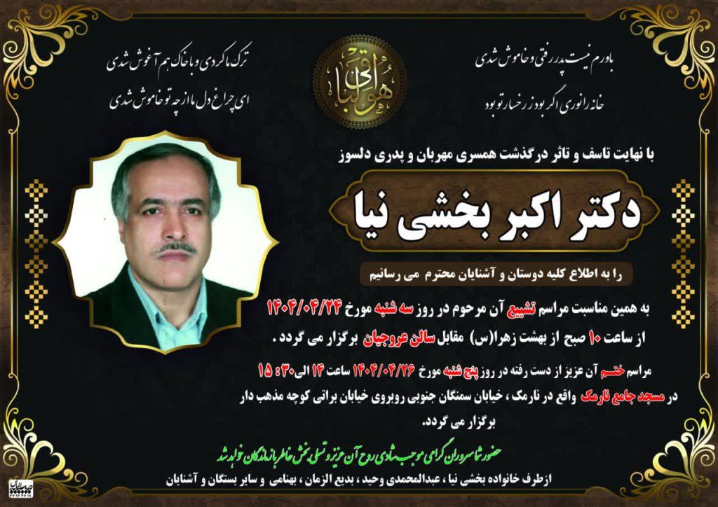 اکبر بخشی نیا که روز گذشته و بعد از یک دوره بیماری از دیر فانی رمیده و به دیار باقی شتافته سالها مددکار اجتماعی حوزه بهداشت و درمان بود و پیشکسوت و بازنشسته واحد مددکاری اجتماعی بیمارستان بود.