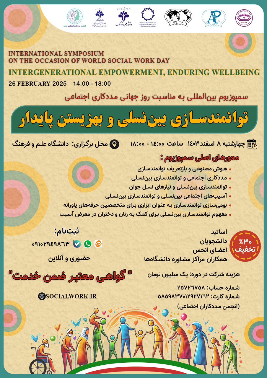 سمپوزیوم تخصصی توانمندسازی بین نسلی و به زیستن پایدار به مناسبت ماه جهانی مددکاری اجتماعی ۸ اسفند ۱۴۰۳ برگزار خواهد شد.