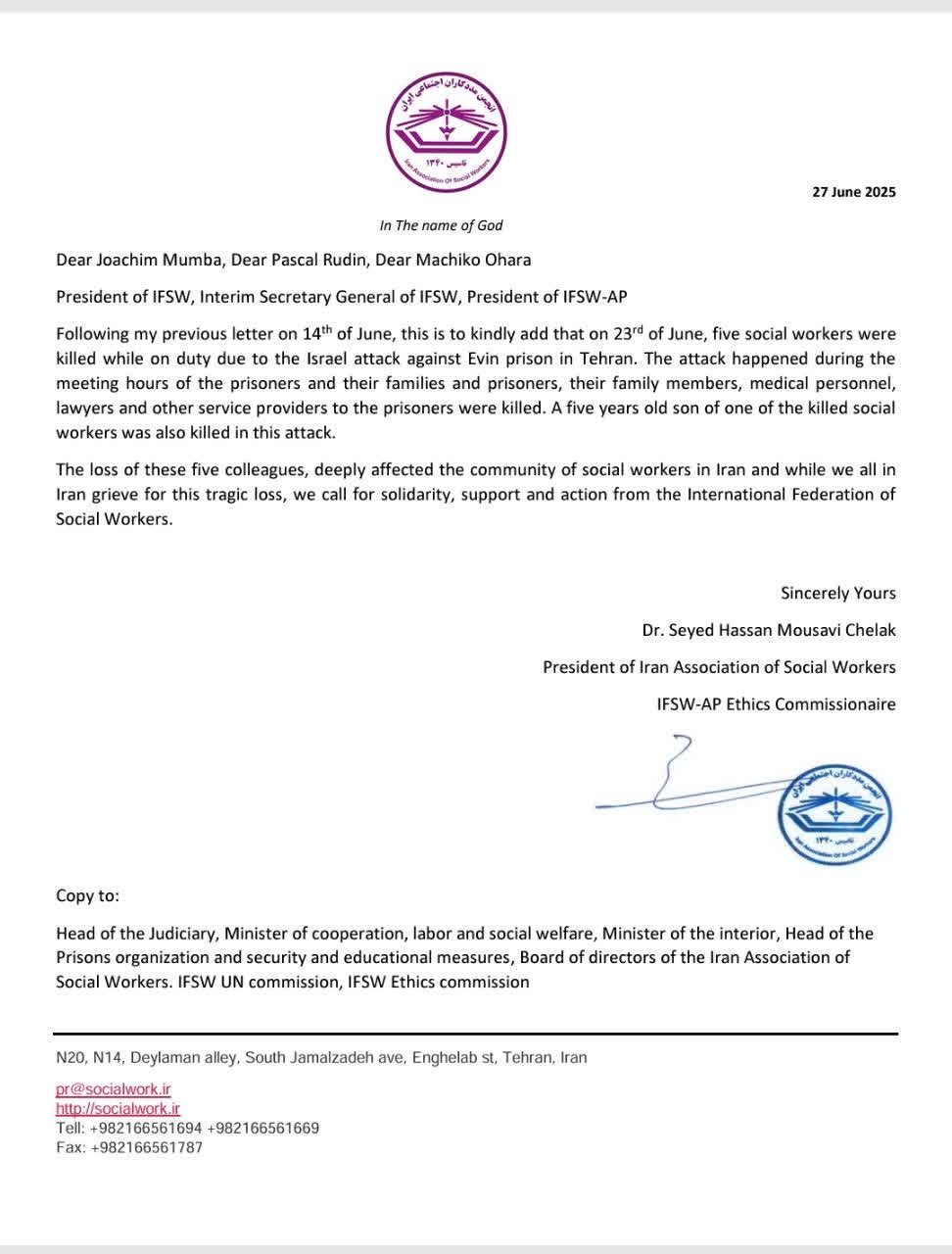 انجمن مددکاران اجتماعی ایران، دومین نامه مبنی بر درخواست محکومیت اسرائیل در پی حمله به افراد و مراکز حمایتی به ویژه زندان اوین که منجر به شهادت تعداد زیادی از شهروندان ایرانی از جمله ۵ مددکار اجتماعی شده را به دفتر فدراسیون بین المللی مددکاران اجتماعی ارسال کرد.
