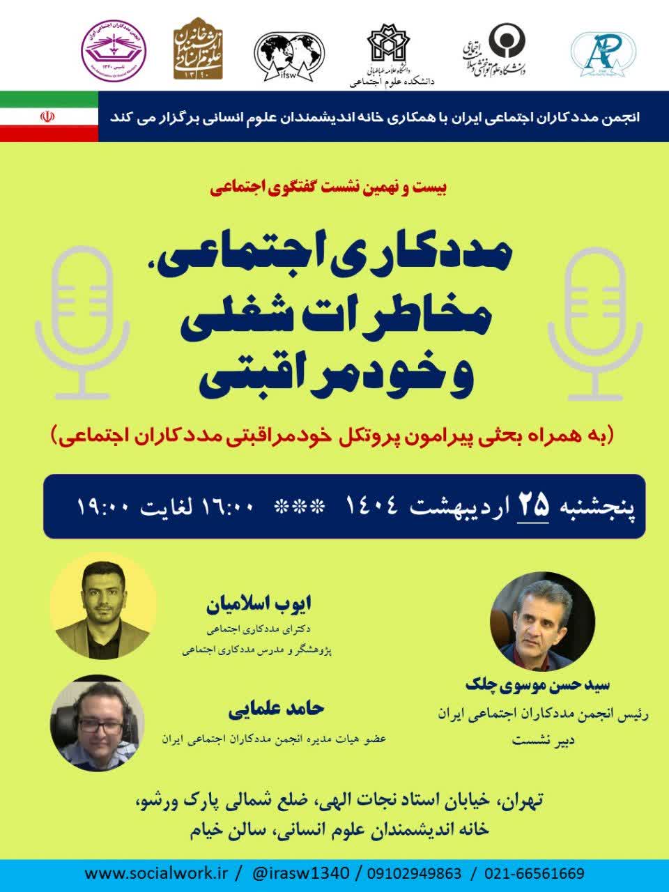 در بیست و نهمین جلسه گفتگوی اجتماعی انجمن مددکاران اجتماعی ایران موضوع مددکاری اجتماعی، مخاطرات شغلی و خودمراقبتی به همراه بحثی پیرامون پروتکل خودمراقبتی مددکاران اجتماعی عصر روز پنجشنبه از ساعت ۱۶ لغایت ۱۹ در سالن خیام خانه اندیشمندان علوم انسانی واقع در تهران خ ویلا (نجات الهی) ضلع شمالی پارک ورشو برگزار خواهد شد. شرکت در این برنامه برای متخصصین رایگان و آزاد است.