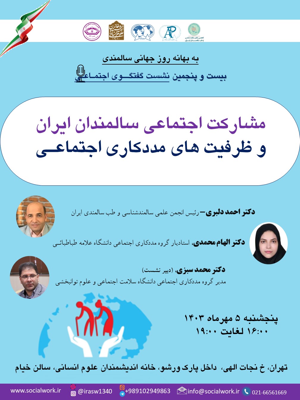 بیست و پنجمین نشست گفتگوی اجتماعی انجمن مددکاران اجتماعی ایران با موضوع “مشارکت اجتماعی سالمندان و ظرفیت های مددکاری اجتماعی” روز پنجشنبه ۵ مهرماه از ساعت ۱۶:۰۰ لغایت ۱۹:۰۰ در خانه اندیشمندان علوم انسانی تهران برگزار خواهد شد.