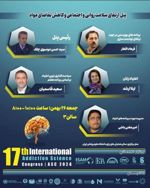 پنل تخصصی “ارتقای سلامت روانی- اجتماعی و کاهش تقاضای مواد” به عنوان یکی از پنلهای هفدهمین کنگره بین الملی دانش اعتیاد روز جمعه ۲۶ بهمن ماه ساعت ۸ صبح برگزار خواهد شد.