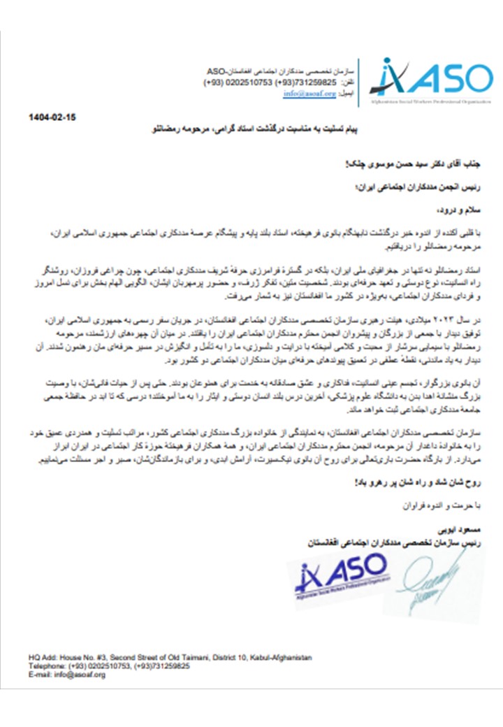 پیام تسلیت سازمان مددکاران اجتماعی افغانستان به مناسبت درگذشت سرکار خانم رمضانلو + تصویر نامه
