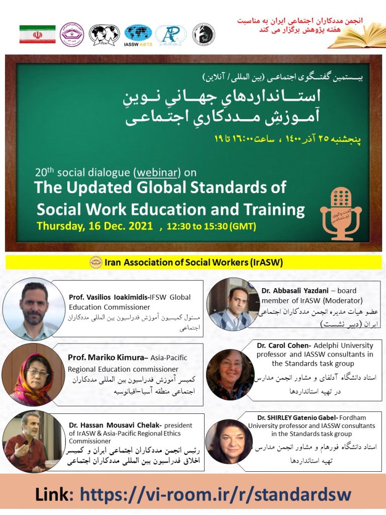 در این برنامه که به صورت وبینار انجام می شود استانداردهای آموزش و کارورزی که در تابستان سال گذشته از سوی اعضای فدراسیون بین المللی مددکاران اجتماعی (IFSW)و نیز مجمع عمومی انجمن بین المللی آموزشگاه های مددکاری اجتماعی (IASSW) مورد بررسی قرار خواهد گرفت.