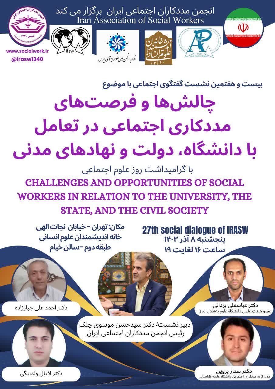 گفتگوی اجتماعی بیست و هفتم: چالشها و فرصتهای مددکاری اجتماعی در تعامل با دانشگاه، دولت و نهادهای مدنی