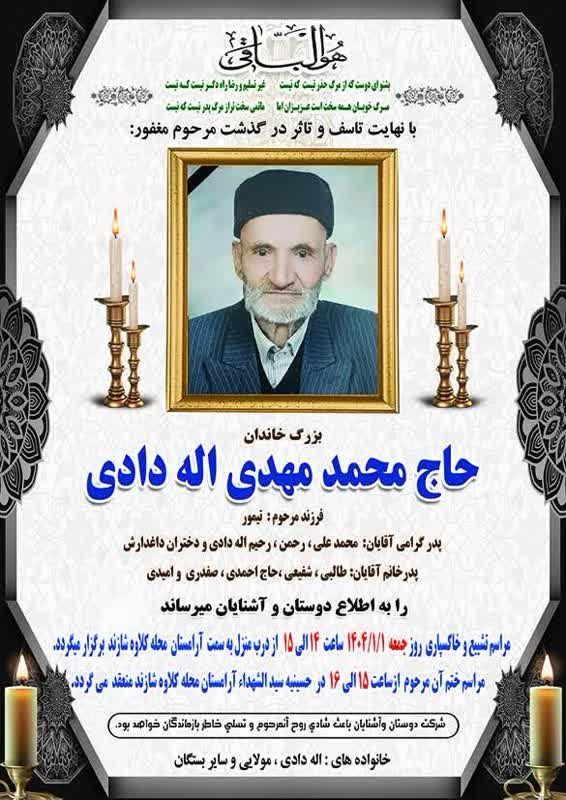 با نهایت تأثر مطلع شدیم، جناب آقای محمدعلی اله دادی، مسئول محترم دفتر انجمن در استان مرکزی در عزای فقدان پدر بزرگوارشان نشسته اند.